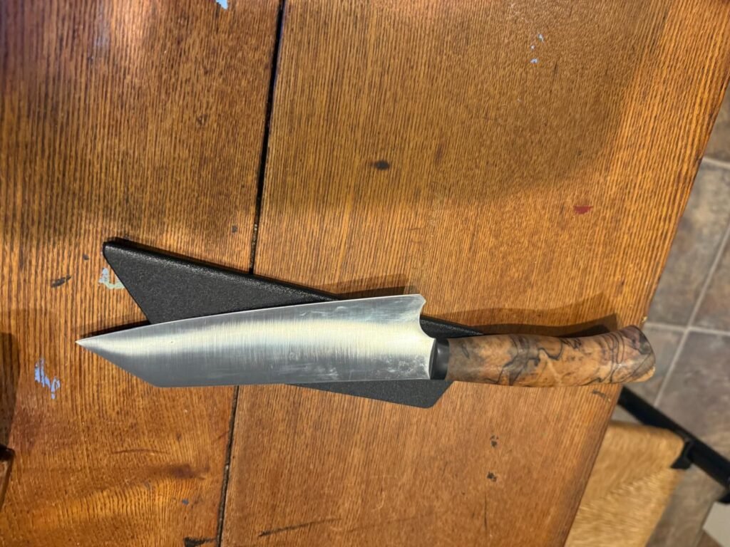 1. Tony Baker Knots of Nature Chef’s Knife: This knife was a collaboration between Tony and his wife, Amber, a master Craftswoman in her own right, with input from 2 award-winning Chefs. It is my go-to knife for kitchen work. Made from Swedish Sandvik 14C28N: Blade Length overall: 7” Cutting surface: 6” 1/2”: Tanto style tip. Handle Material is a beautiful, stabilized spalted Maple with a very comfortable, slight palm swell, and comes with a lined nylon drawer sheath. Price $400.00 each.